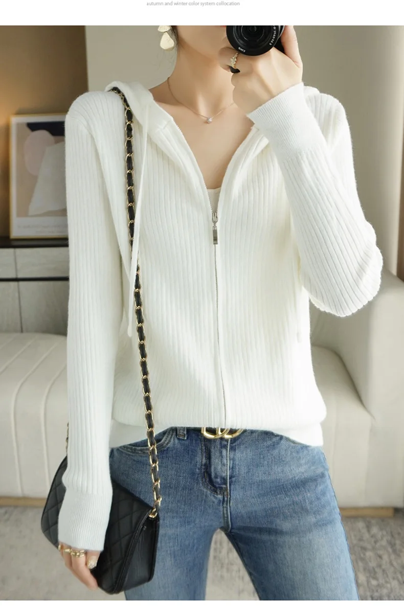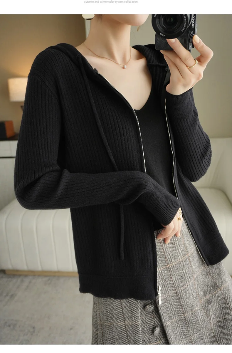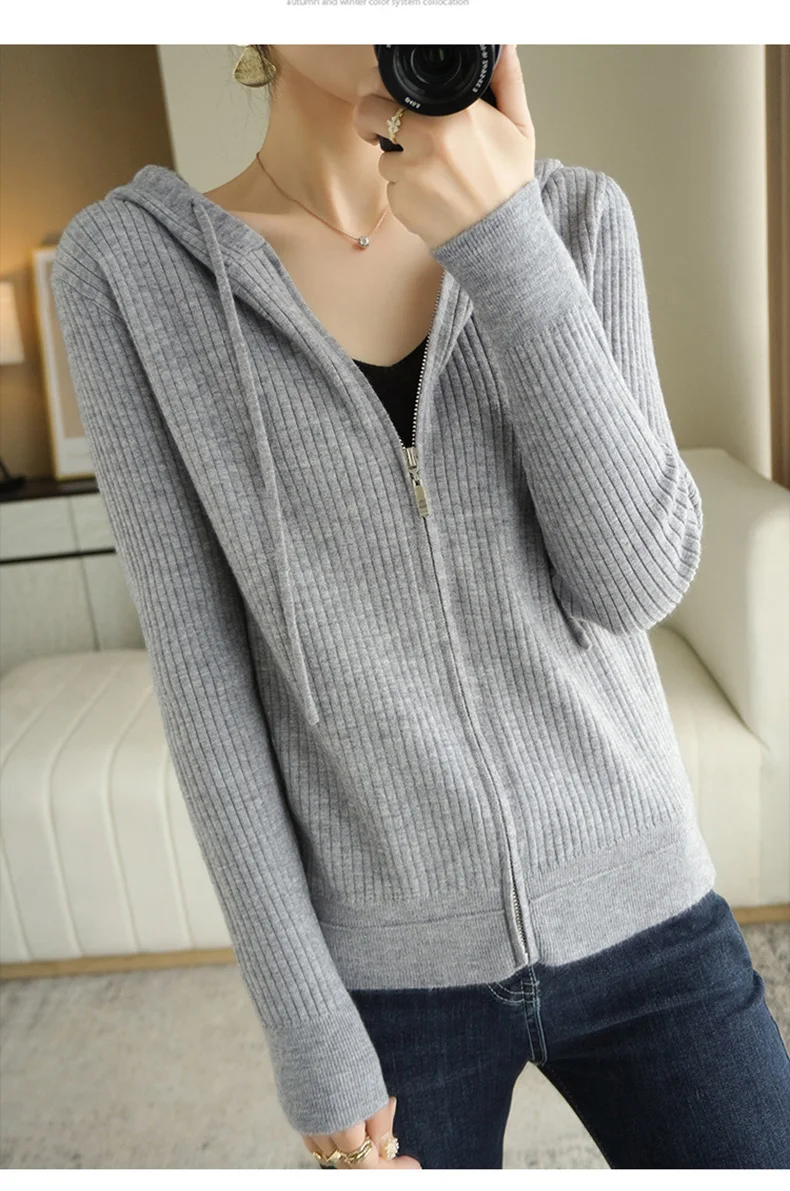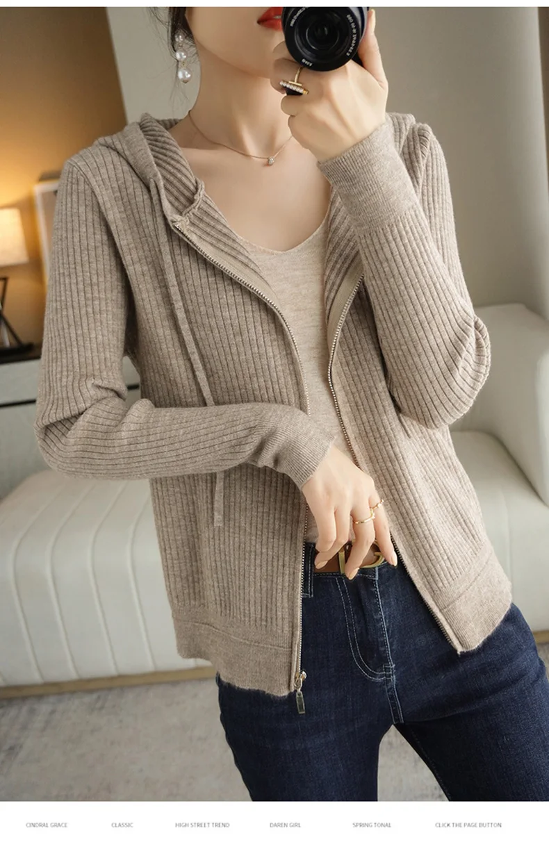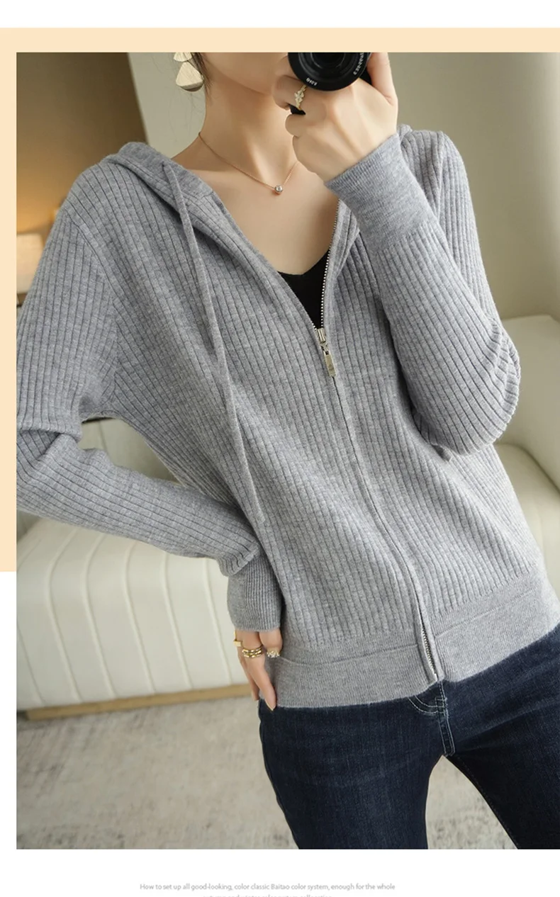 Buttery Soft 100% Pure Merino Wool Knitted Zipper Hooded Cardigan
