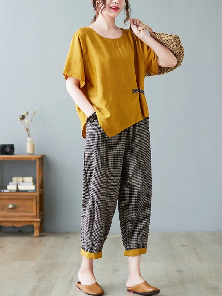 Cotton Linen 2-Piece Comfy Sets with Solid Top & CheckerBoard Loose Ankle-Length Pants