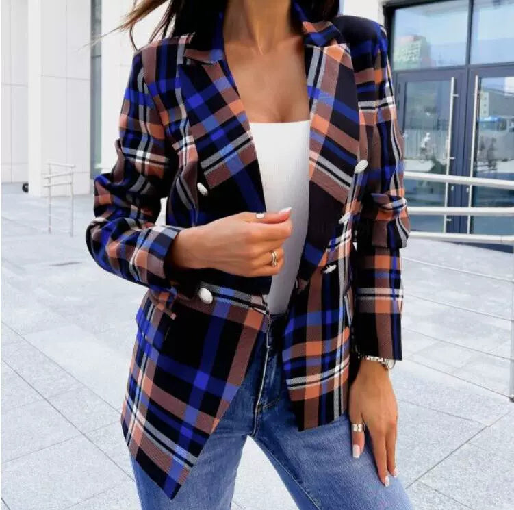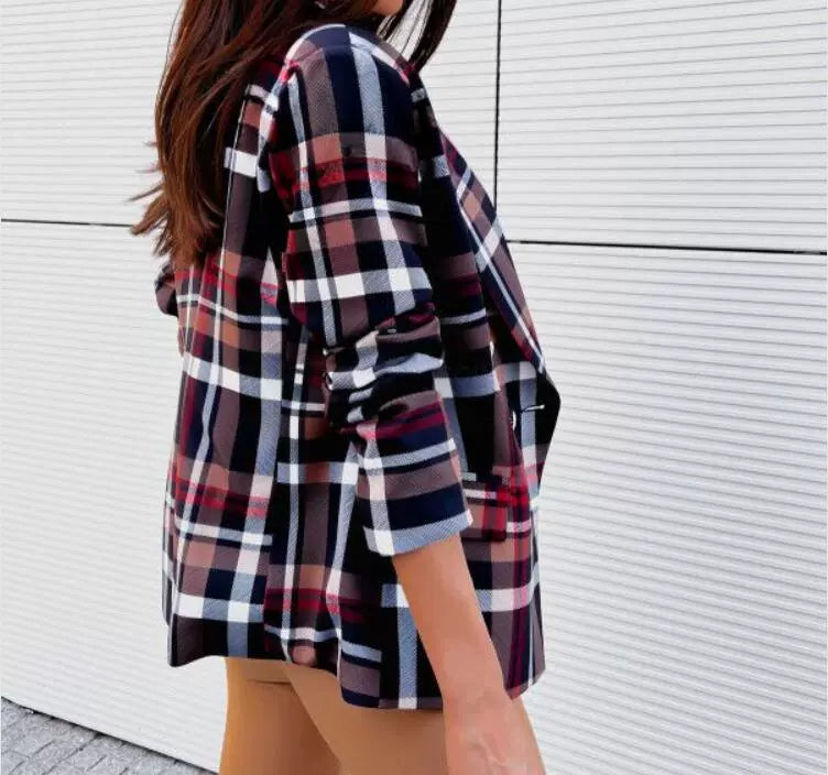 No matter what the day brings. the Total Styler Blazer will always have you looking cute. Adorned with a plaid print that will never go out of style. it shapes a double-breasted design for a timeless yet modern appearance. The notched lapels and long sleeves offer a classic look. while the buttons elevate the overall visual interest. finished with flap pockets. Add to the cart now before it sells out.