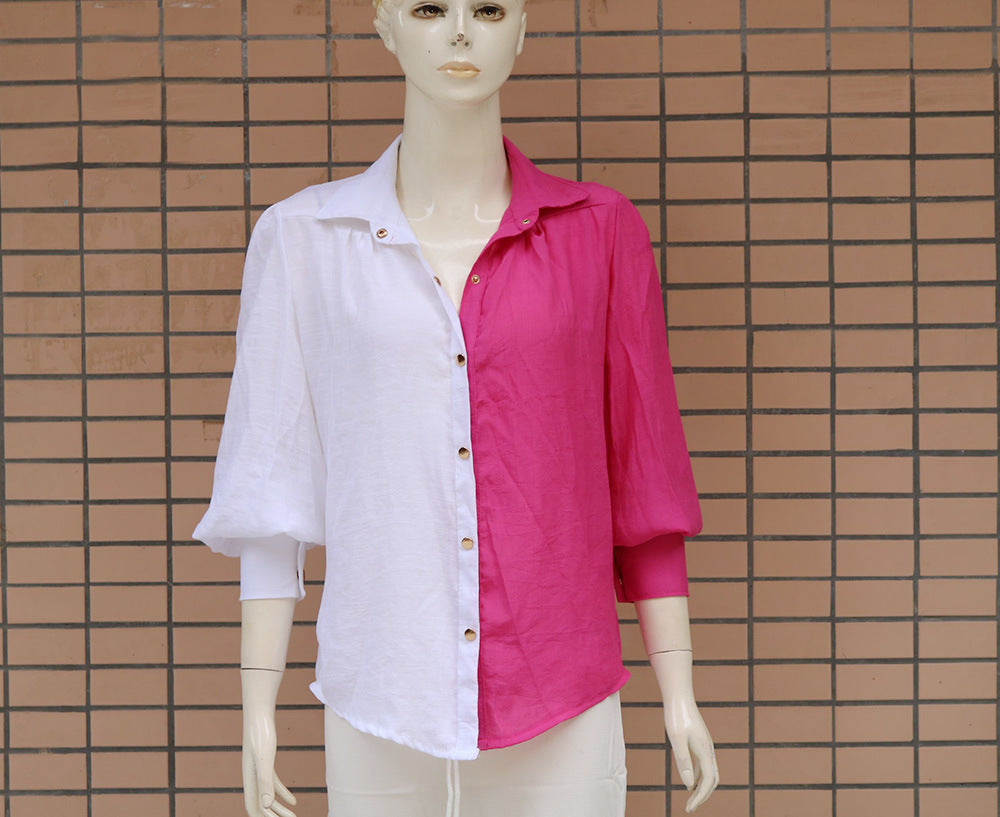 Bold Contrast Polyester Puff Sleeves Loose Shirt