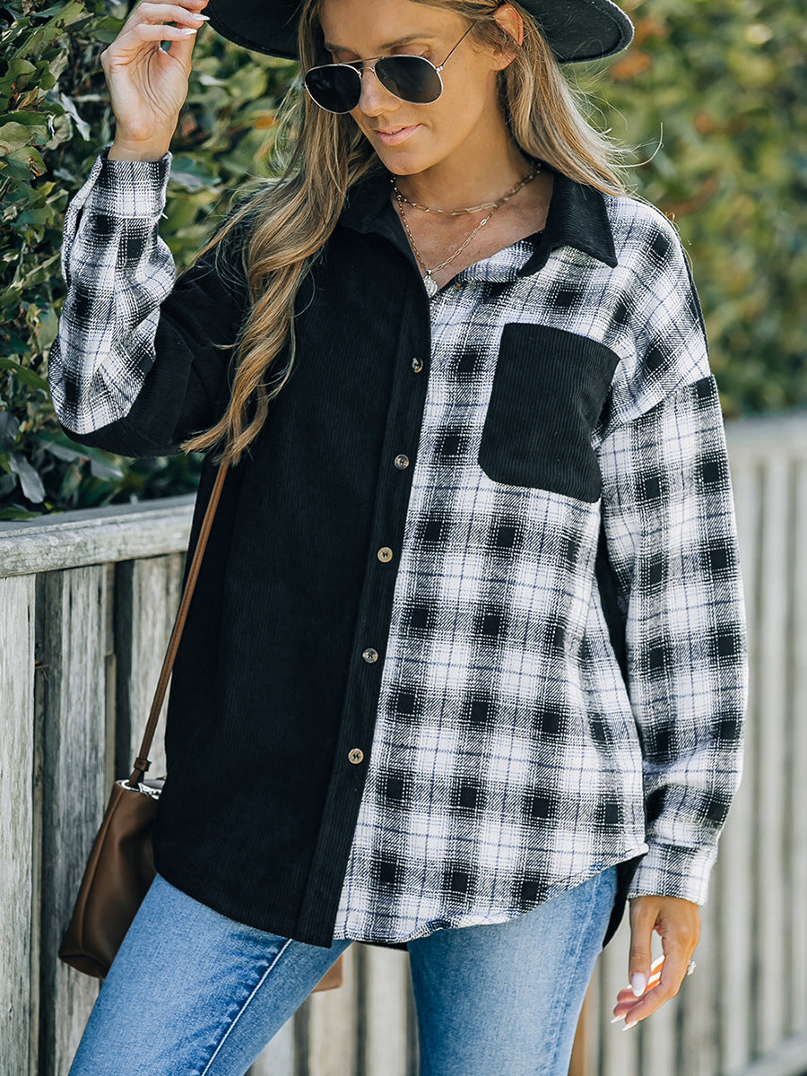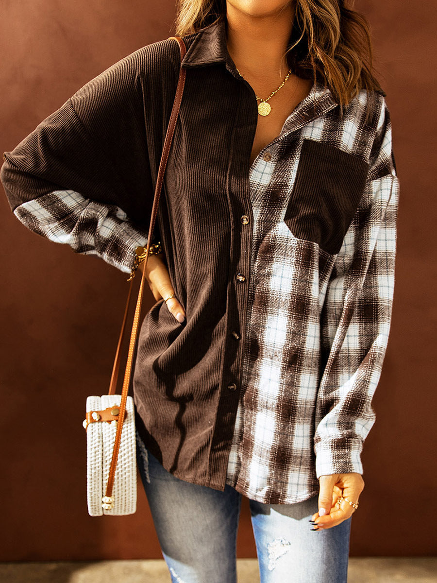 Stay stylish and cozy in our Women's Long Sleeve Loose Pockets Woolen Shirt. This versatile cardigan features a color block two-tone design with a checkered pattern on one side and a solid color on the other. The loose fit and pocketed design make it both comfortable and functional. Made with high-quality polyester fabric for lasting wear. Whether you're dressing up for a formal occasion or going casual. this versatile shirt is sure to become a wardrobe staple.