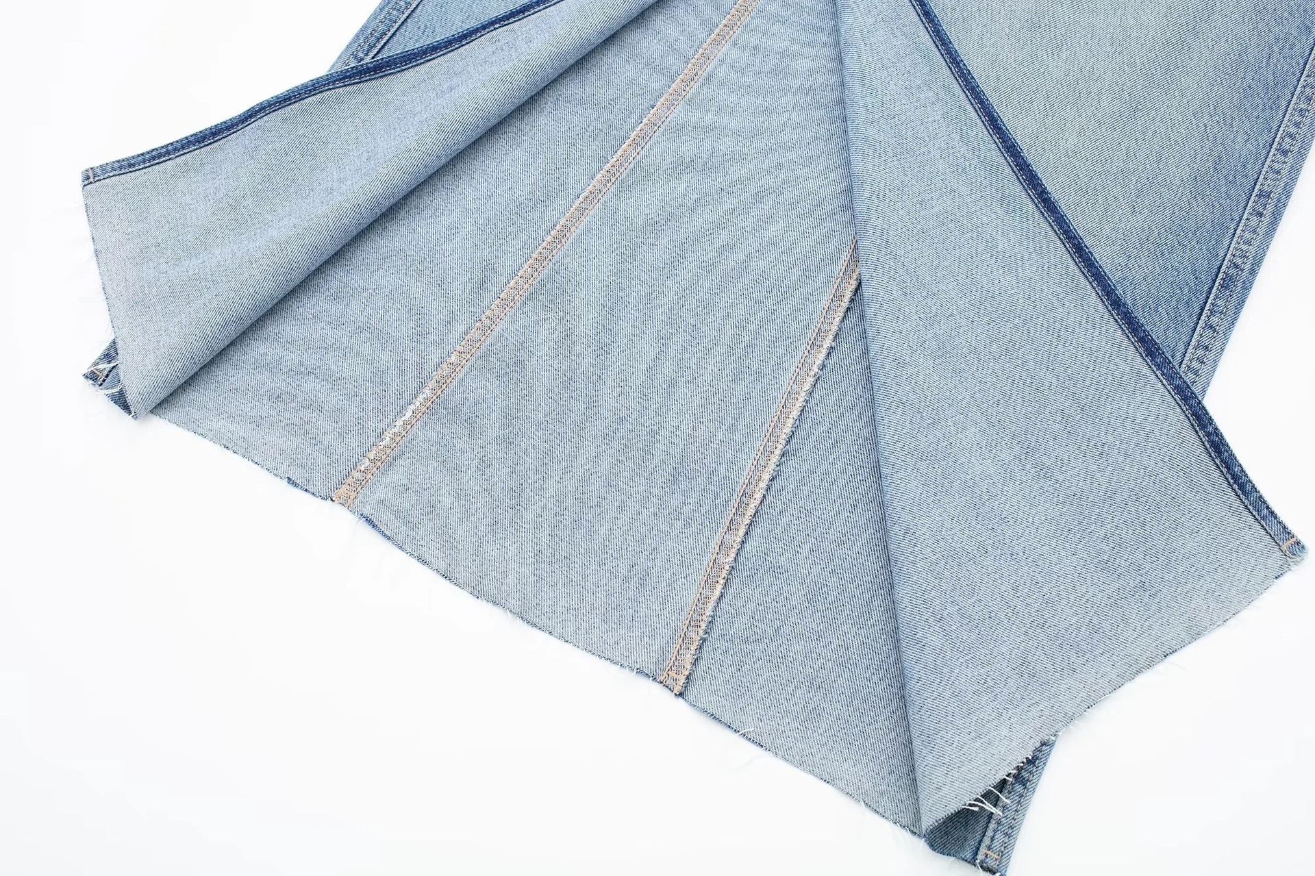 Blue Denim Diagonal Patchwork Mid Rise Skirt