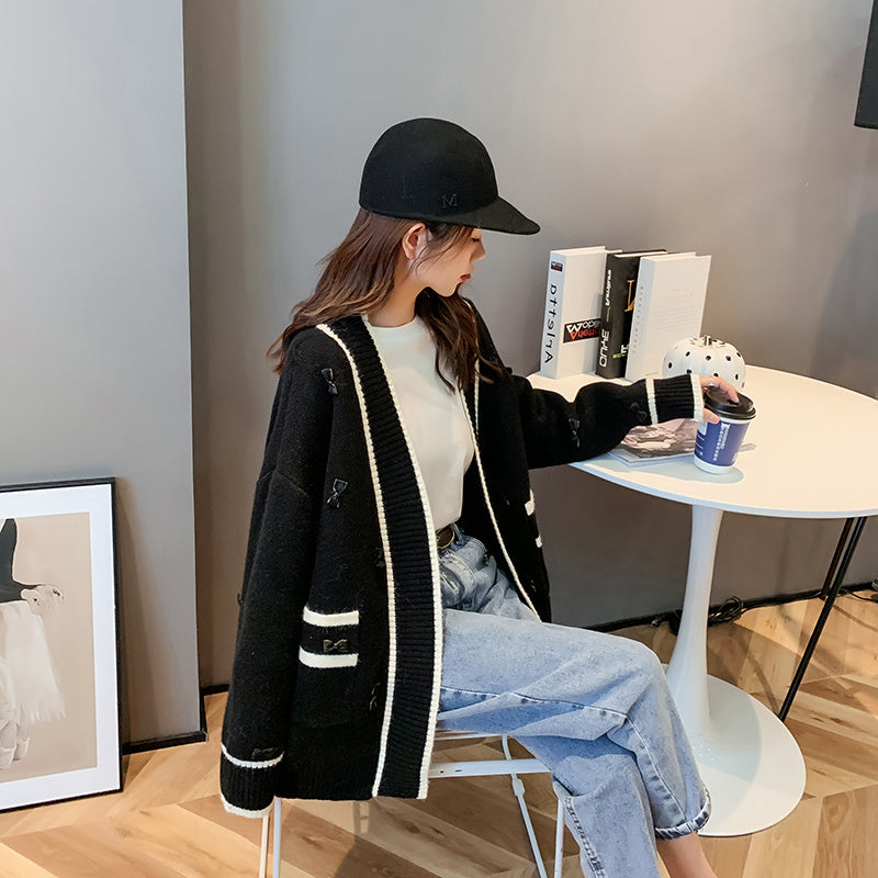 Stay snug and stylish with the Into You Cardigan. Made to lend an effortlessly chic style. the classy knit silhouette shapes an open-front design with long sleeves and a relaxed fit. It is adorned with contrasting-colored bow embellishments to sweeten any ensemble in a single step. elevated by stripes along the edges to add definition. This elegant cardigan is perfect for every day. Order yours now before it's too late!