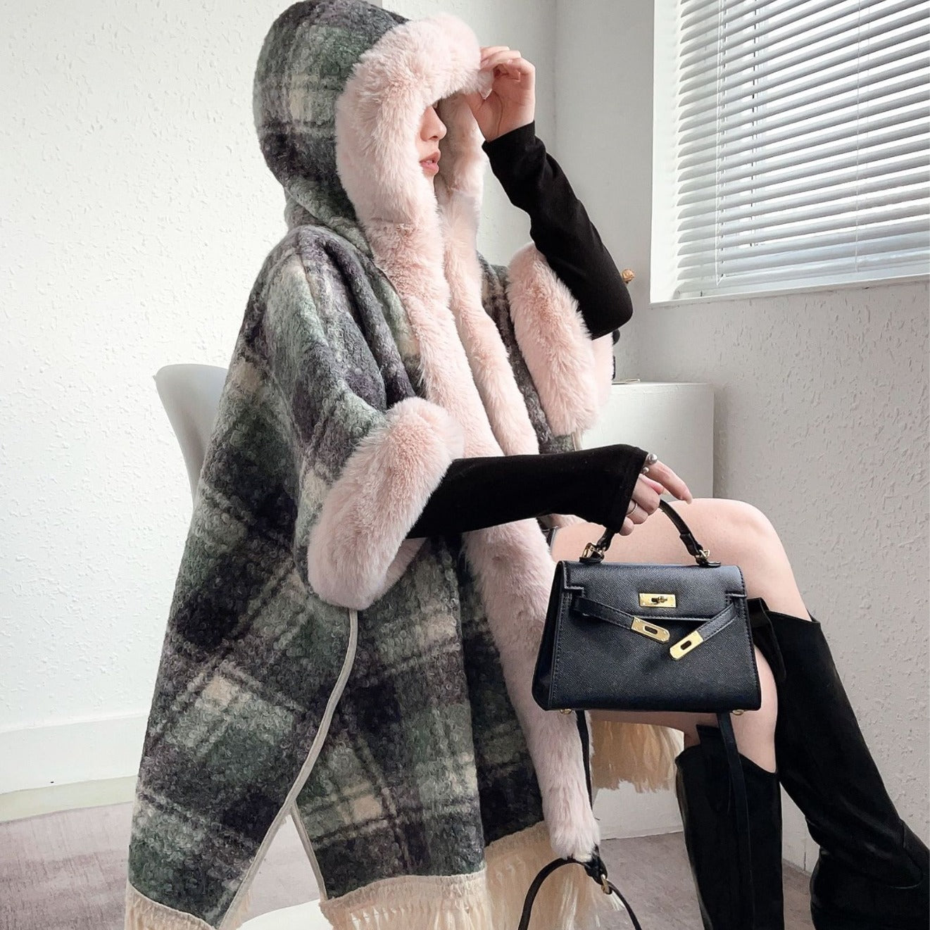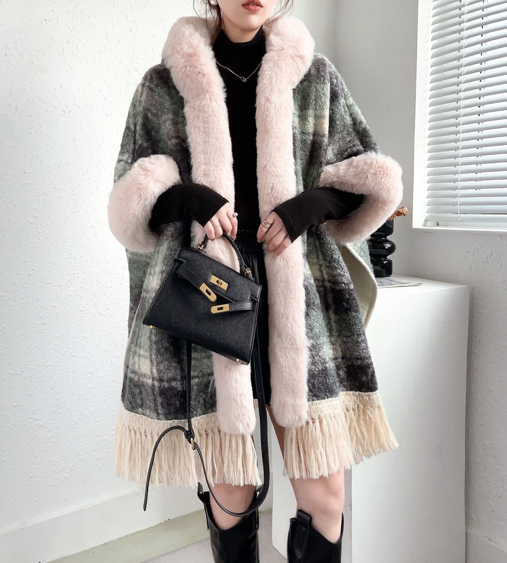 This classic Fleece Lined Padded Warm Mid Length Tassel Cape reflects your classy. feminine style. A fashion true to your luxurious taste. this marvellous cape features a polyester fibre structure in a plaid cape style with a hoodie cap. fur details and woollen tassels hanging down the hem border. This loose open cape looks fantastic with all sorts of winter attire and keeps you warm and cosy while not compromising your significant style statement.