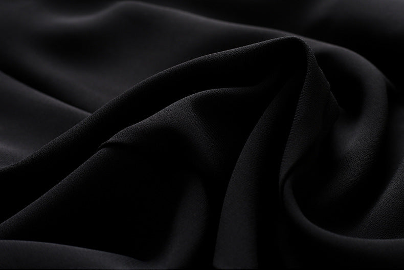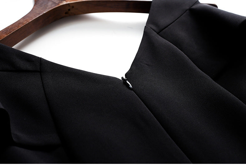 - A sleek V-neck collar adds allure