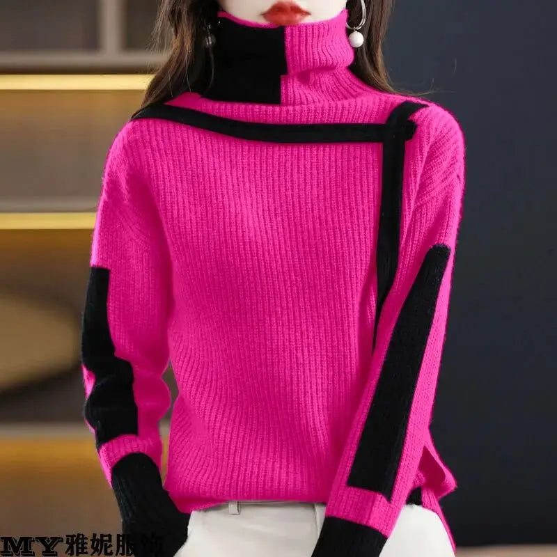 Patchwork Art Design Knit Sweater with High-Collar& Raglan Sleeve