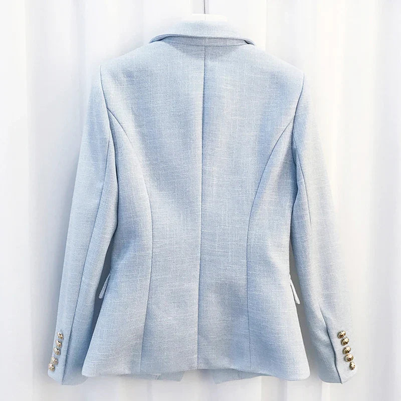 Whenever in doubt. slip on the Power Move Blazer Jacket for that ultra-professional look. It showcases a double-breasted design for that elegant ensemble. featuring notched lapels. long sleeves and front flap pockets to add to the style. Metal lion buttons shine in gold for a luxurious look. making it the perfect pick for those who love to stand out from the rest. Shop the style now and make it yours!