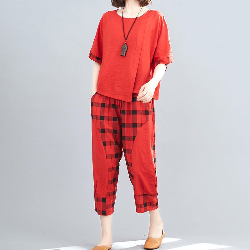 Comfy 2-piece Casual Sports Set with Loose Short-Sleeved Top & Checkerboard Pants