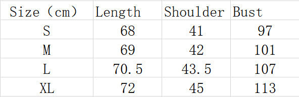 | Size | Front Length (in) | Shoulder (in) | Bust (in) | Sleeve Length (in) |