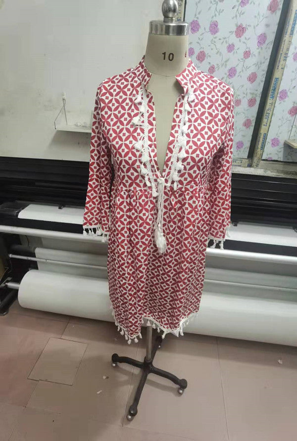 Featuring a stunning print and playful tassel details. this dress is the perfect choice for any occasion. Embrace your unique style and make a statement with this must-have addition to your wardrobe.