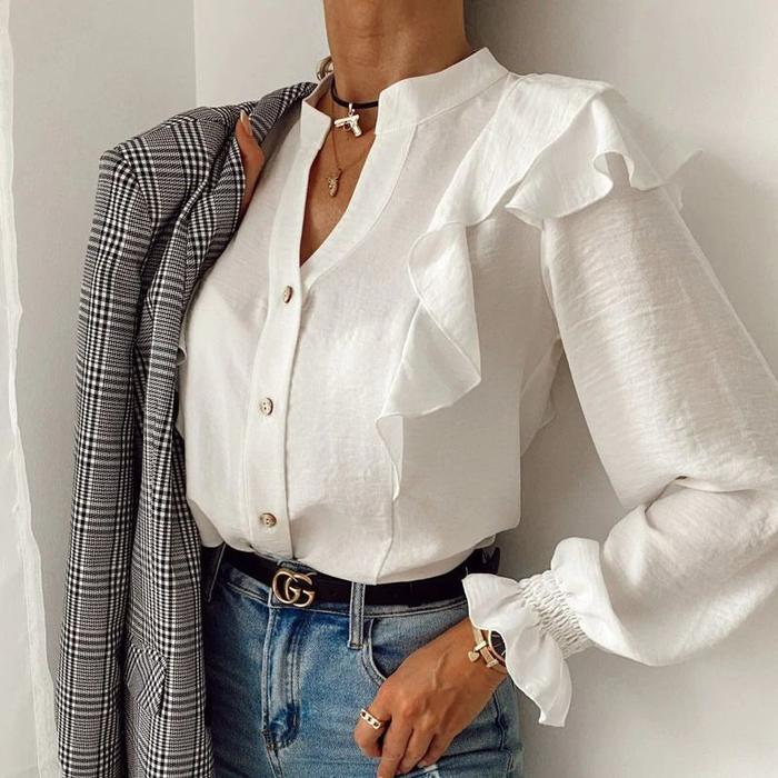 Made of comfortable and lightweight polyester fiber. this cardigan-style shirt is perfect for the office. Its versatile design and long sleeves make it suitable for any working woman's wardrobe. Designed with the modern professional in mind. its sleek button-up style and long sleeves exude elegance. making it suitable for office wear or business meetings.