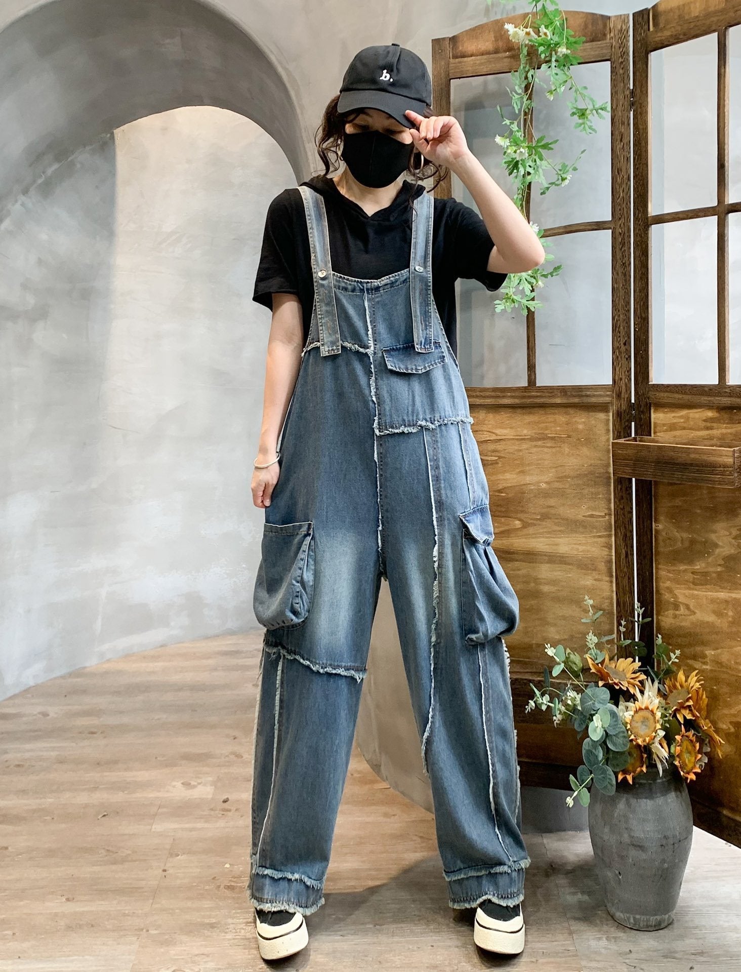 Retro Pocket Raw Edge Denim Suspender Pants