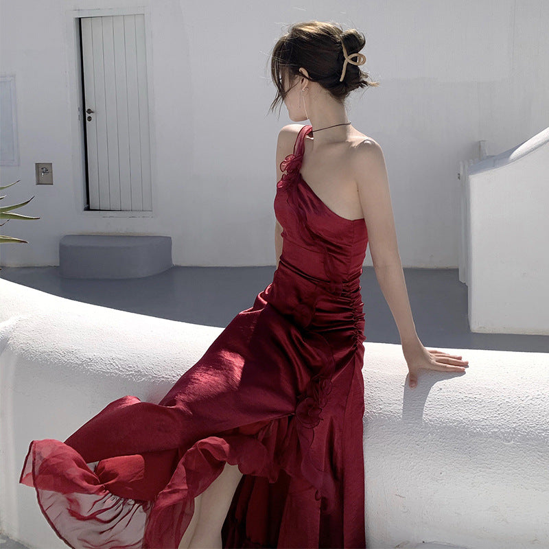 Made with sleek satin fabric and a fitted silhouette. this dress will accentuate your curves and elevate your style. Designed with an oblique shoulder and a high waist A-line skirt. it effortlessly accentuates your curves while exuding timeless charm. The backless design adds a touch of allure. ensuring all eyes are on you wherever you go. Made from premium polyester fiber. our dress offers the perfect blend of comfort and luxury. so you can feel as good as you look.