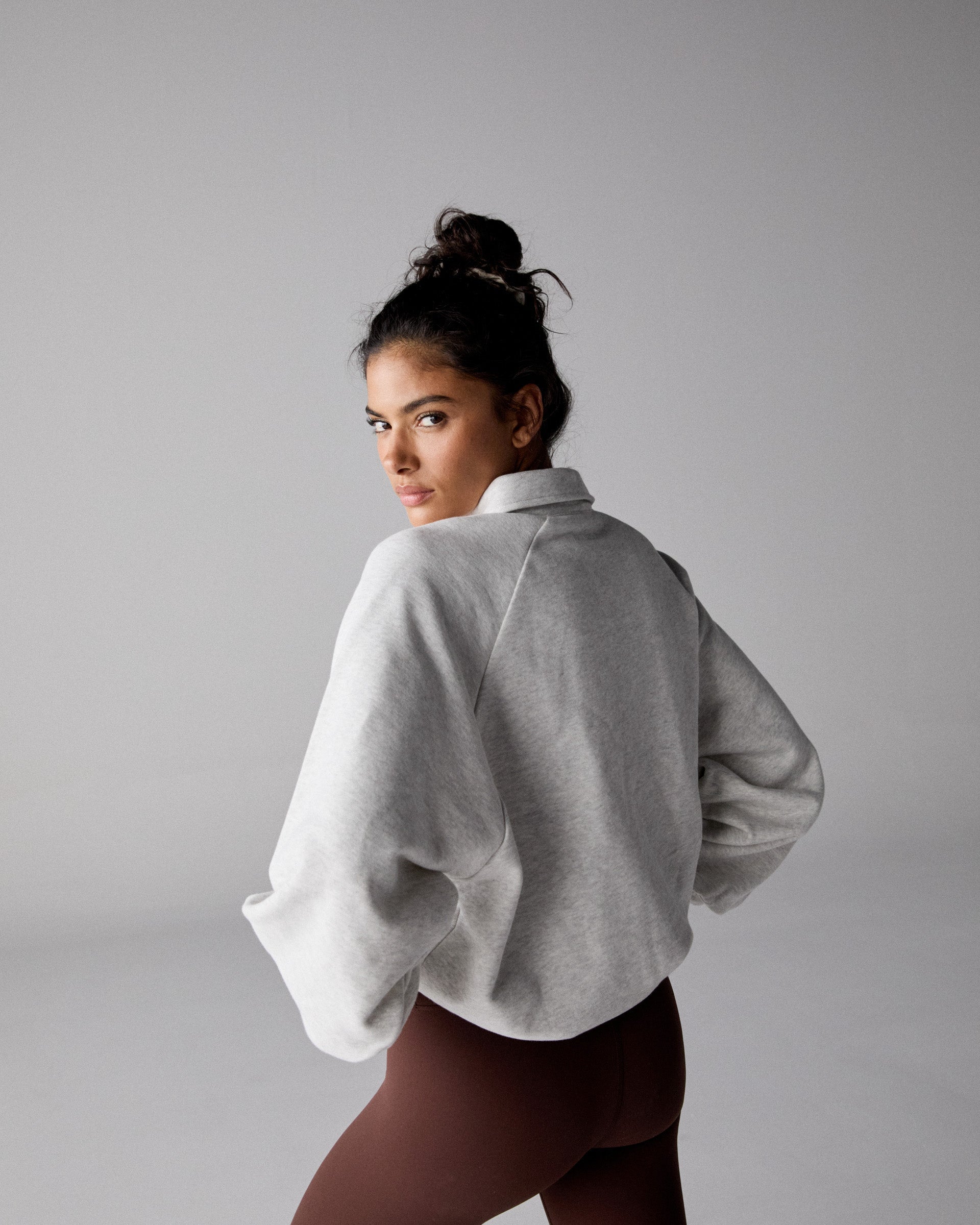 The Slouchy Button Up Sweatshirt is a timeless wardrobe essential. It has a relaxed polo collar. embroidery on the back. poppers fastening on the front and has a relaxed slouchy silhouette. Wear yours with the Ultimate Leggings for laid back days.
