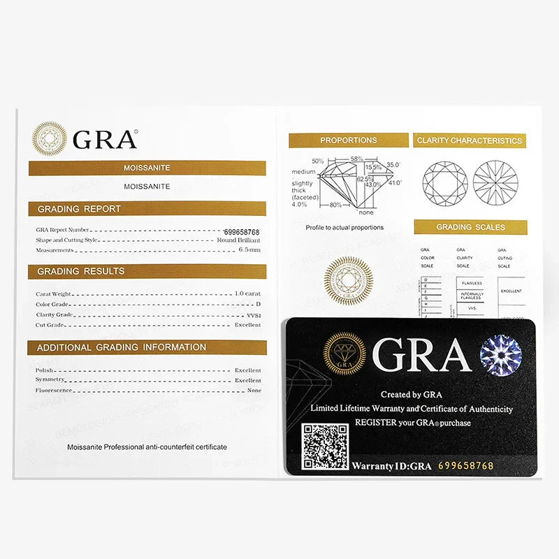 A GRA Certificate is a report that contains all the information about the stone. including its shape. cutting style. measurements. carat weight. color grade. clarity grade. cut grade. polish. symmetry. fluorescence. and clarity characteristics. The Certificate is used to verify the stones authenticity and can increase the resale value of the piece.