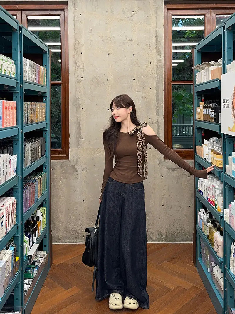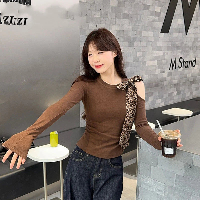 Coffee Leopard Round Neck Long Sleeve Slim Top