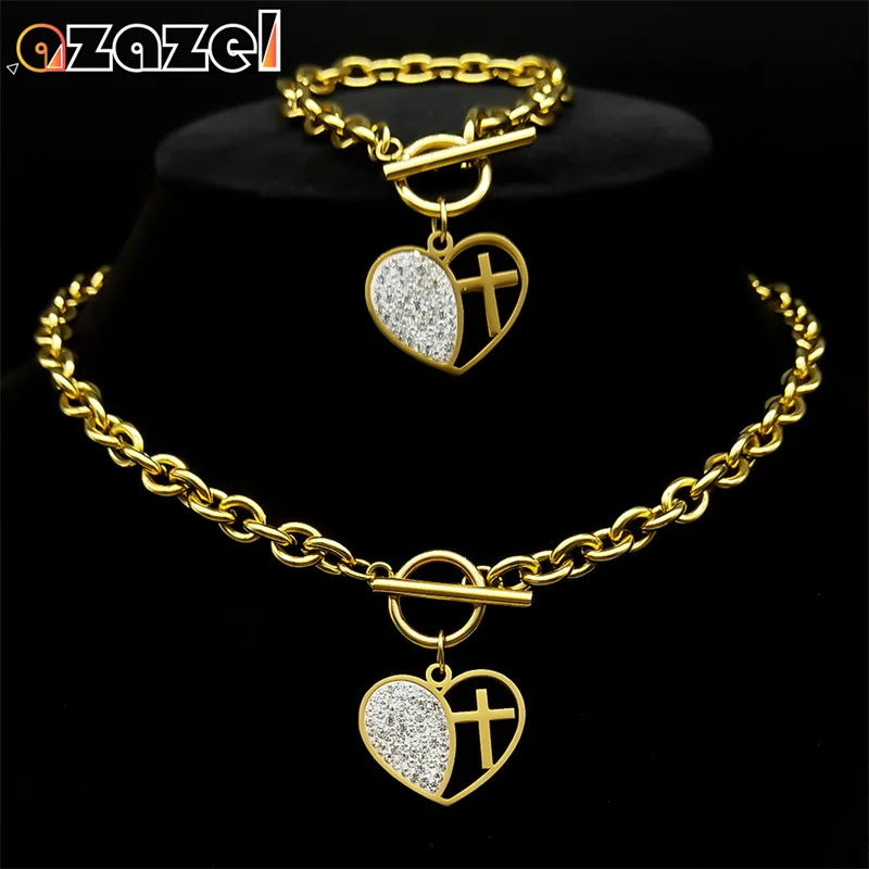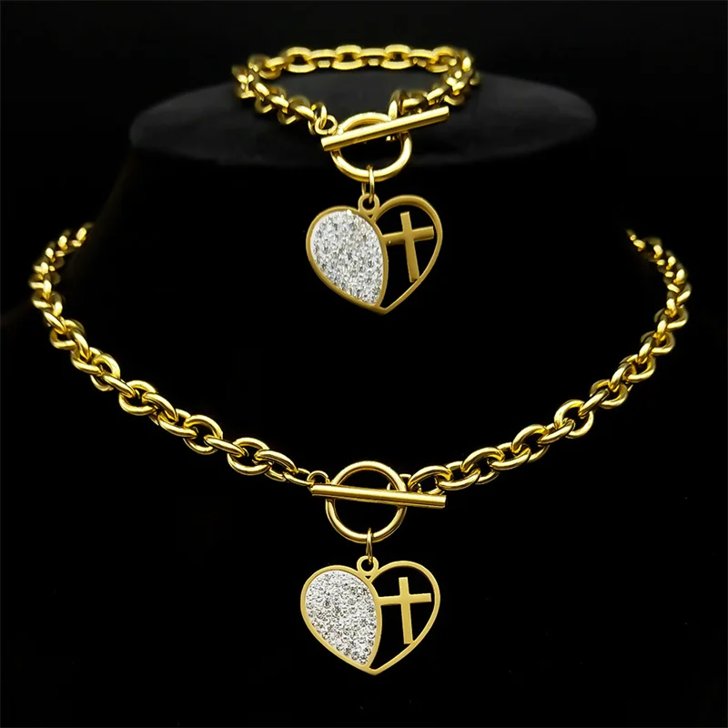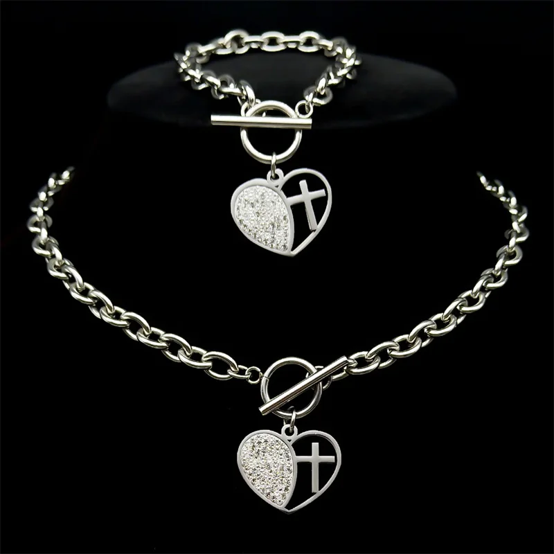 Rhinestone Heart Cross Matching Pendant & Bracelet Jewelry Set