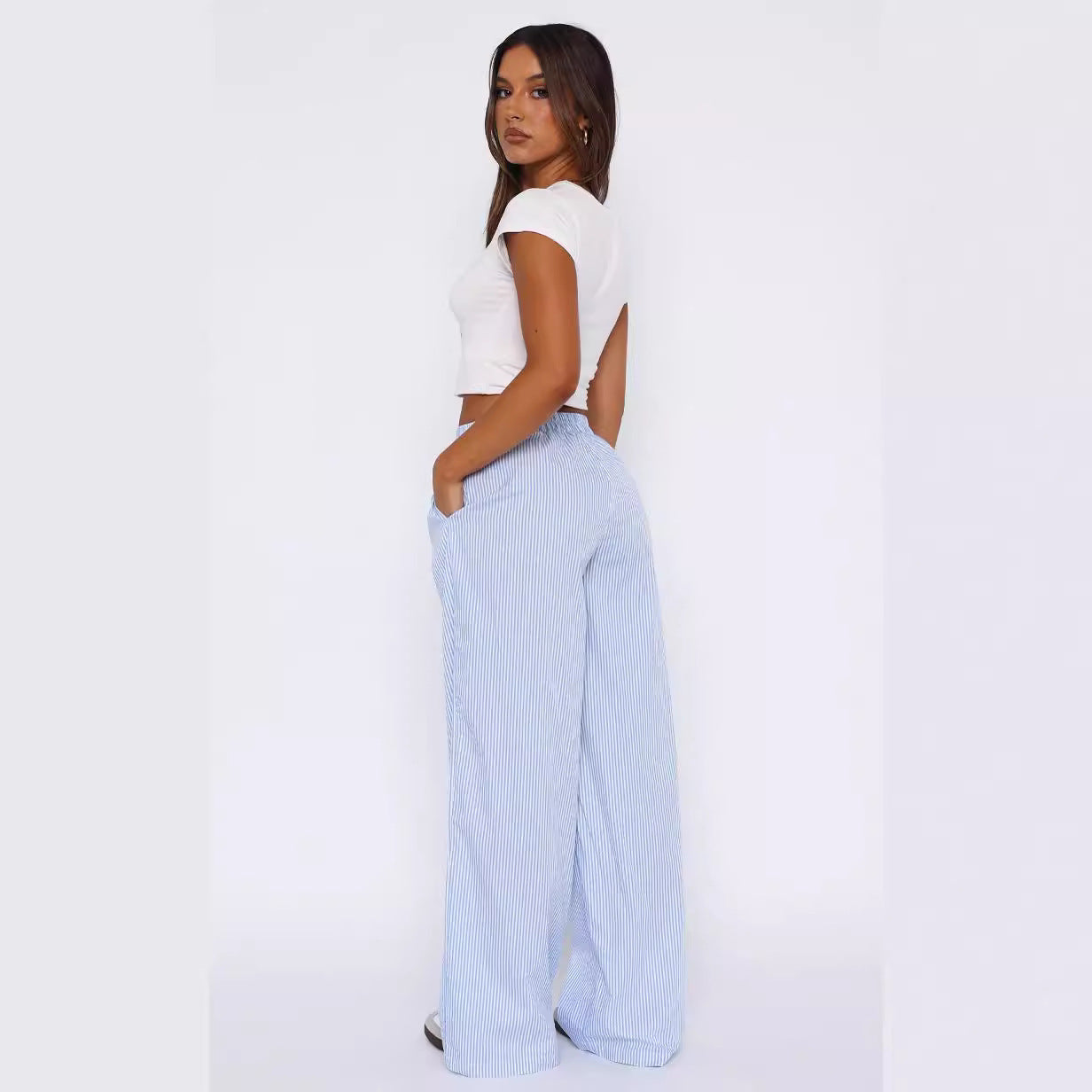 These stylish pants feature a flattering high waist and a wide-leg design for a comfortable and chic fit. The striped pattern adds a touch of elegance to any occasion. Available in blue stripes and pink stripes. these trousers feature an elastic high waist and wide leg design. perfect for creating chic and effortless looks. Whether you're lounging at home or heading out for a day of adventure. these pants are sure to make a