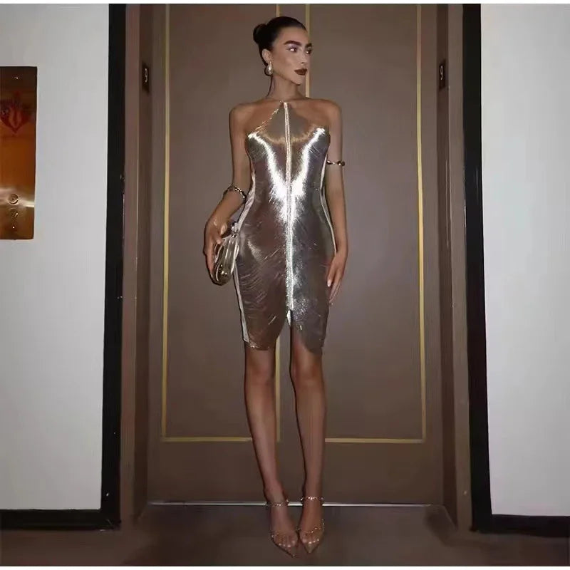 Get ready to turn heads in this Shiny Tassels HalterOff Shoulder Sleeveless Slim Mini Dress!