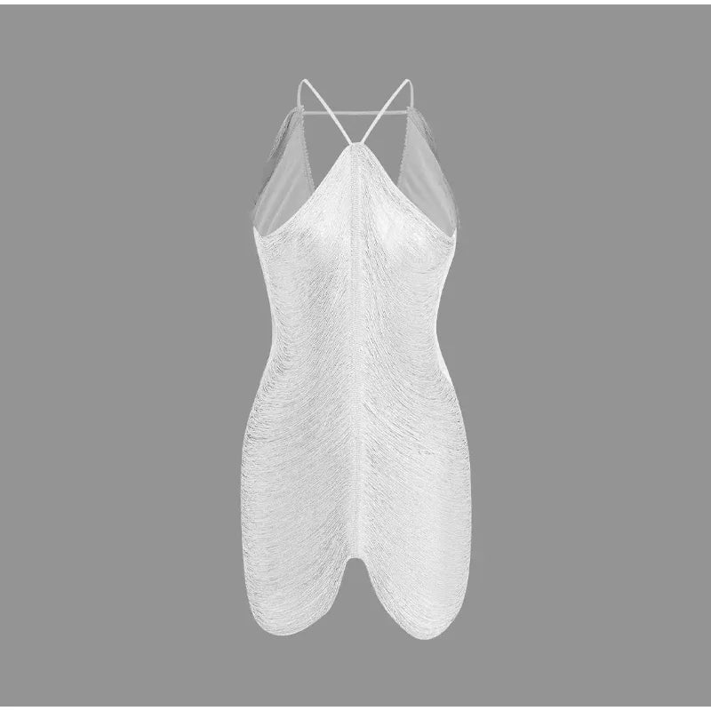 Shiny Tassels Halter Off Shoulder Sleeveless Slim Mini Dress