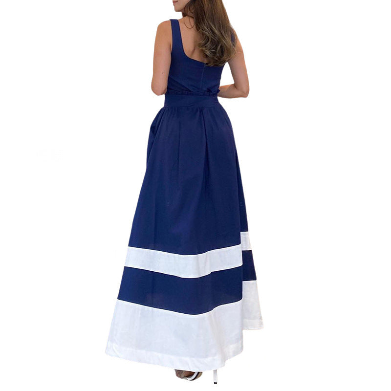 Women's Fashion Suspenders Square Collar Stitching Mid-length Dress