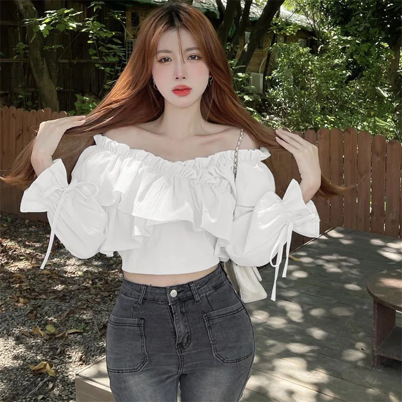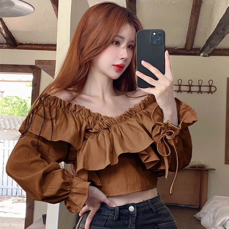 Ruffles Patchwork V-Neck Crop Tops Blouse with Long Sleeve